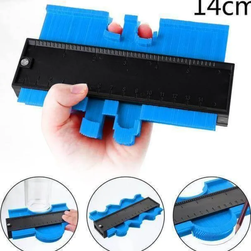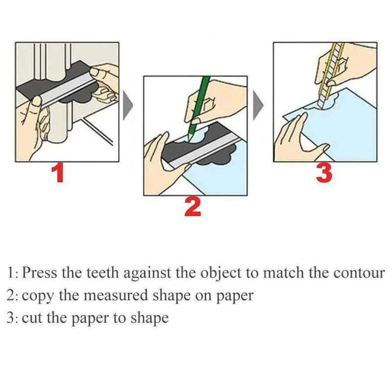 Die einfache Handhabung ist ein wichtiges Merkmal: Drücken Sie die Konturlehre einfach gegen ein Objekt, um dessen Profil zu erfassen, und schneiden Sie es anschließend in Form. Dieses Werkzeug eignet sich hervorragend zum Verlegen von Fliesen, Laminat, Teppichen, zur Maßkontrolle und für Formarbeiten.