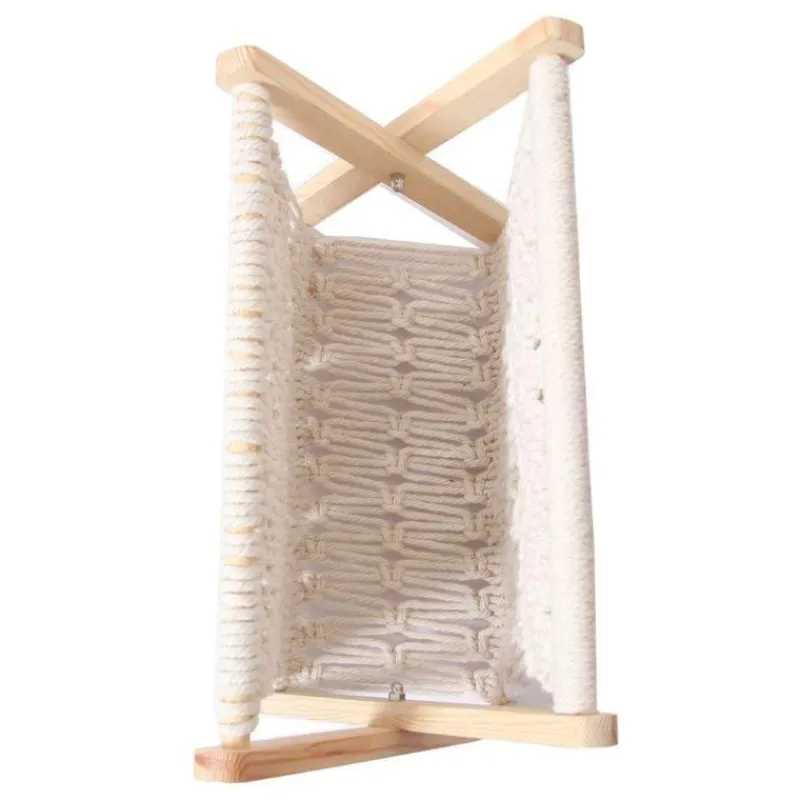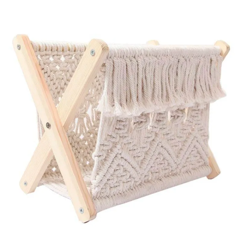 Dieser elegante Mini-Zeitschriftenständer aus Makramee wertet jeden Raum auf – ob Wohnzimmer, Schlafzimmer, Badezimmer, Kinderzimmer oder Büro. Platzieren Sie ihn einfach neben einem Stuhl oder Beistelltisch, um Ihre Lieblingsbücher, Zeitungen, Zeitschriften, Schals und andere Gegenstände übersichtlich und griffbereit aufzubewahren.