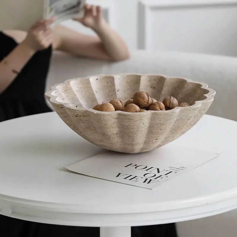 Jede Schale wird sorgfältig von Hand gefertigt, um die einzigartigen Eigenschaften von Travertin hervorzuheben. So erhalten Sie ein einzigartiges Meisterwerk, das die Schönheit der Natur widerspiegelt. Genießen Sie die Ruhe und den Stil, die diese Travertinschale in Ihr Zuhause bringt und sie zu einer durchdachten Ergänzung Ihrer Einrichtung macht.