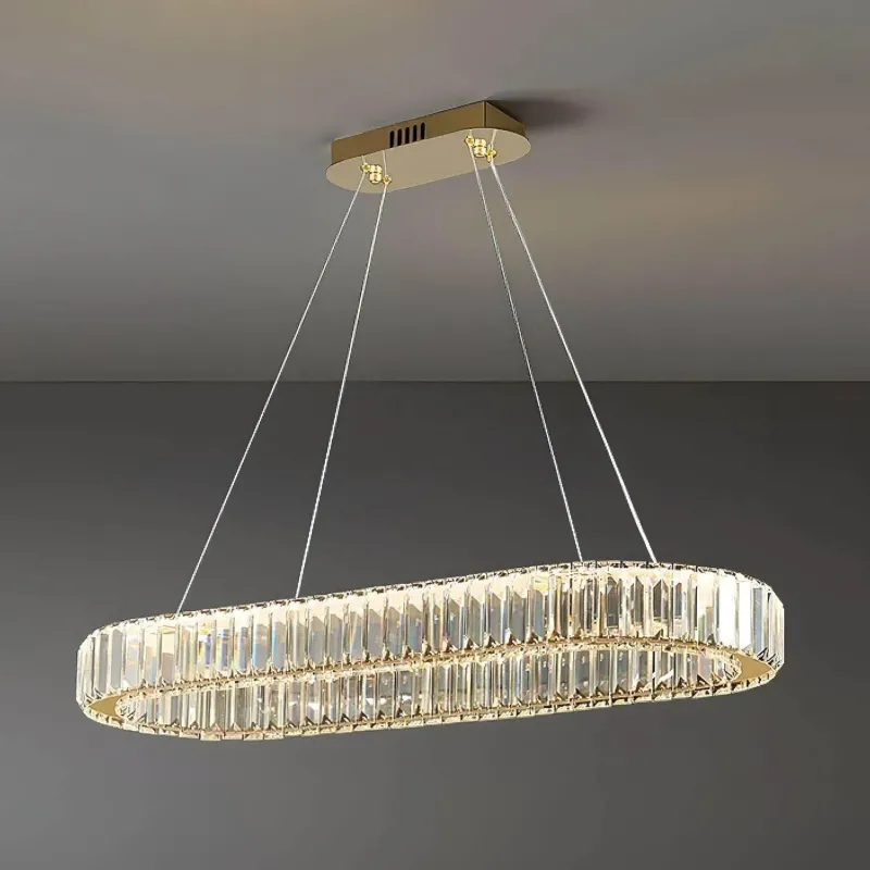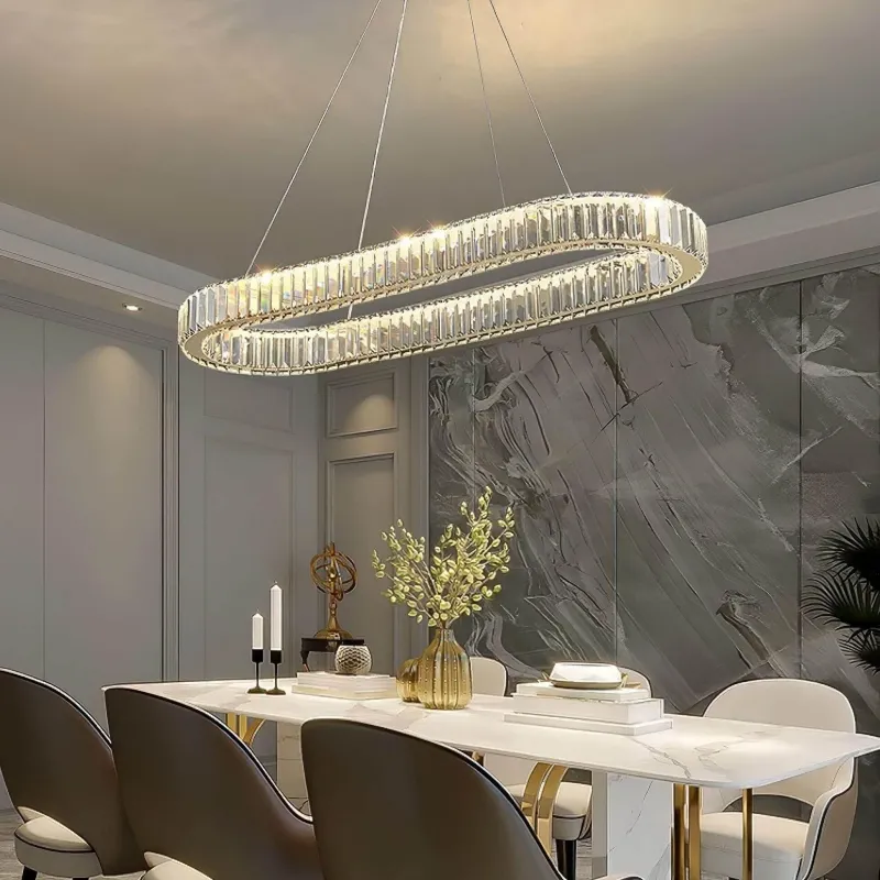 Erleben Sie Eleganz und moderne Raffinesse mit diesem zeitgenössischen Kronleuchter, sorgfältig gefertigt aus hochwertigem K9-Kristall. Seine ovale Form glänzt mit bemerkenswerter Klarheit und Brillanz und zieht Blicke auf sich, da sie das Licht wunderschön einfängt und reflektiert. Die integrierte LED-Beleuchtung strahlt ein warmes, einladendes Licht aus und beleuchtet das filigrane Design und die luxuriöse Verarbeitung des Kronleuchters.