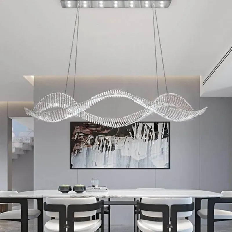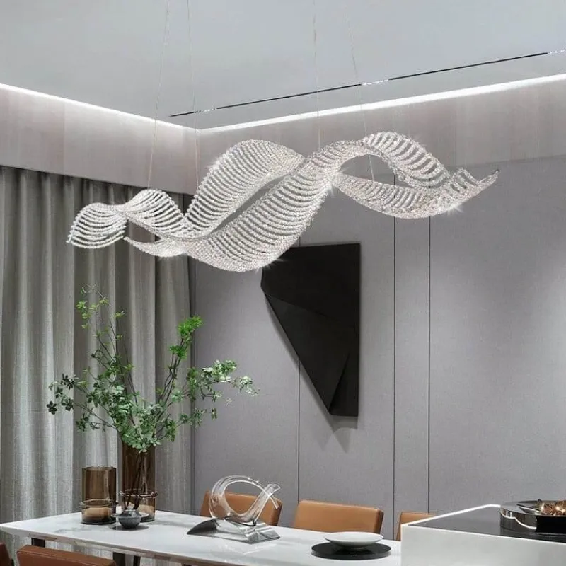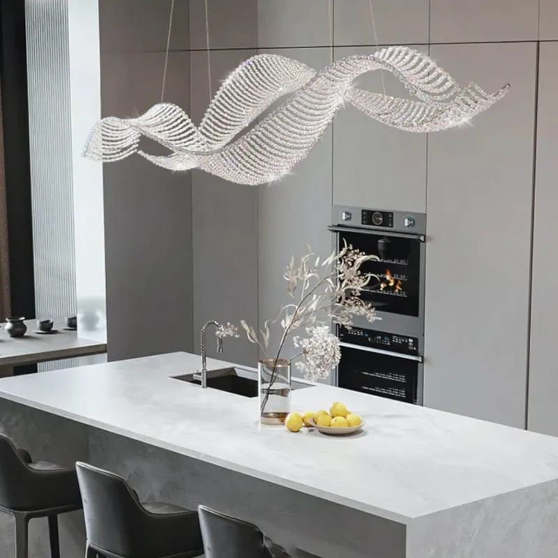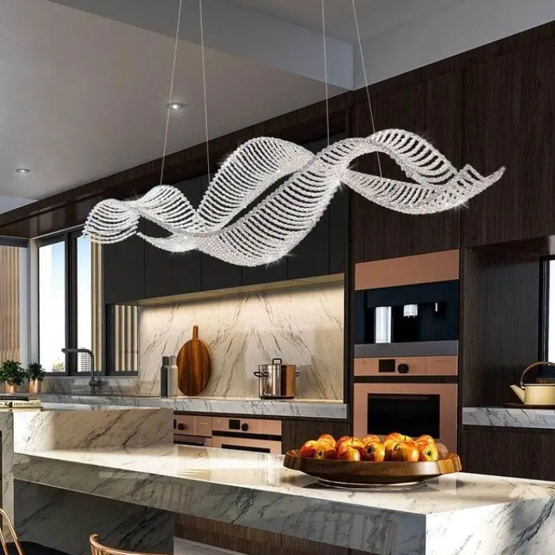 Wir präsentieren eine raffinierte Leuchte, die moderne Eleganz mit einem Hauch von Opulenz verbindet. Das gewellte Kristalldesign dieses Kronleuchters fängt das Licht wunderschön ein und bricht es. So entsteht ein faszinierendes Schauspiel, das jeden Raum in eine Oase des Luxus verwandelt. Inspiriert von der anmutigen Bewegung der Meereswellen bietet dieses Stück mehr als nur Beleuchtung; es sorgt für ein einzigartiges Erlebnis.
