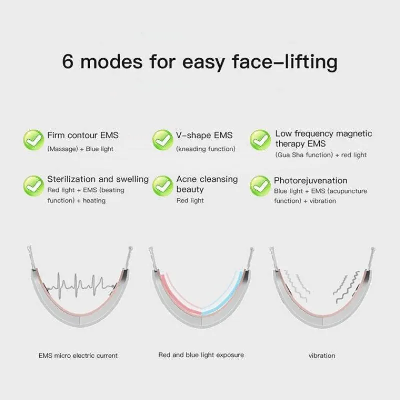 – Modi: Beinhaltet Konturstraffung, V-Formung, Niederfrequenz-Magnetfeldtherapie, Sterilisation und Schwellungsreduzierung, Akne-Reinigung und Photorejuvenation