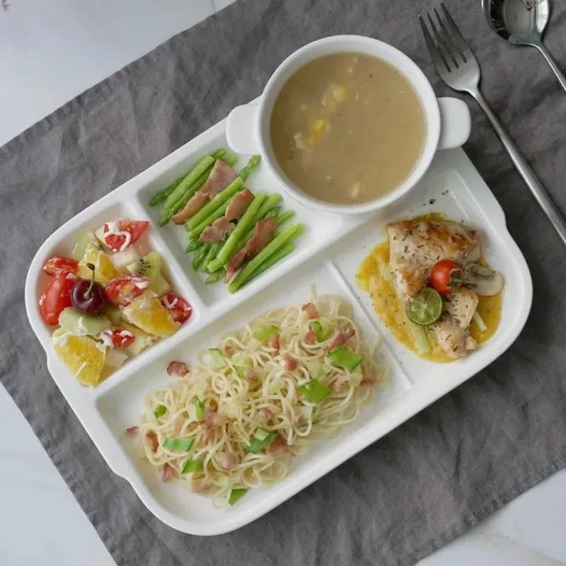 Mit seiner schlanken, rechteckigen Form und dem minimalistischen Design passt dieser Teller perfekt zu jedem Tischgedeck. Die Unterteilung bietet die perfekte Lösung zum Trennen verschiedener Speisen und eignet sich ideal zur Portionskontrolle oder zur Präsentation einer köstlichen Auswahl an Snacks.