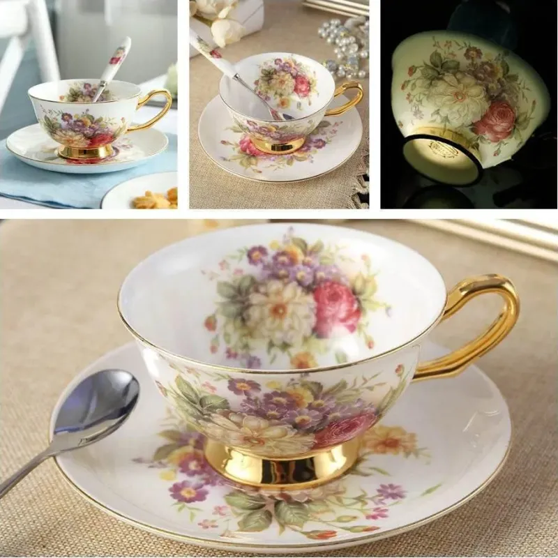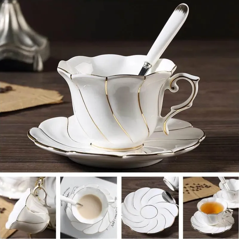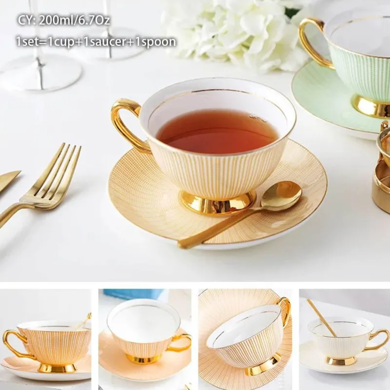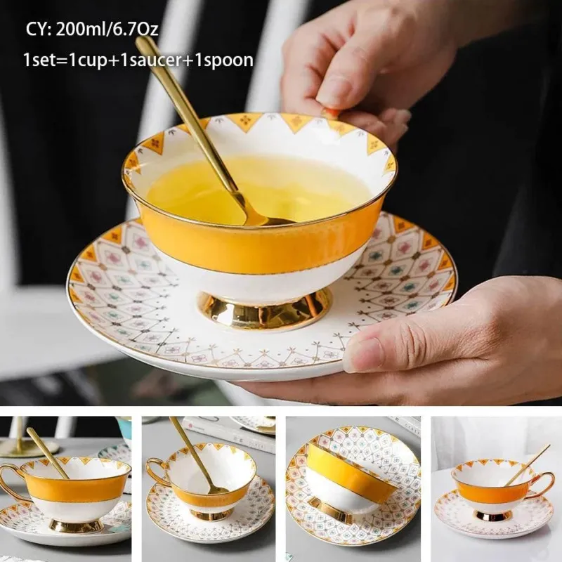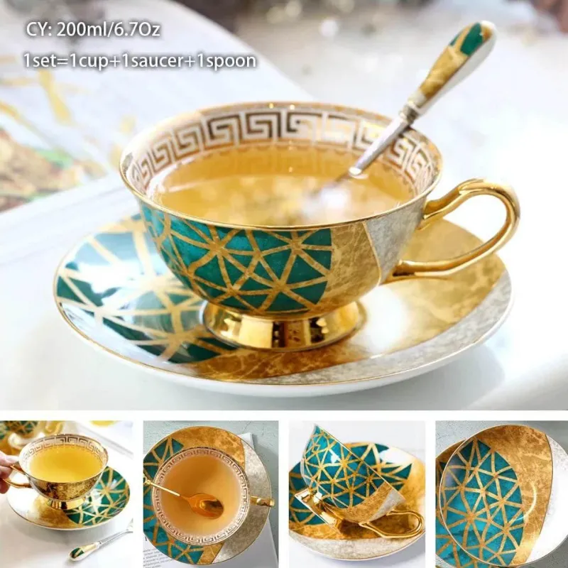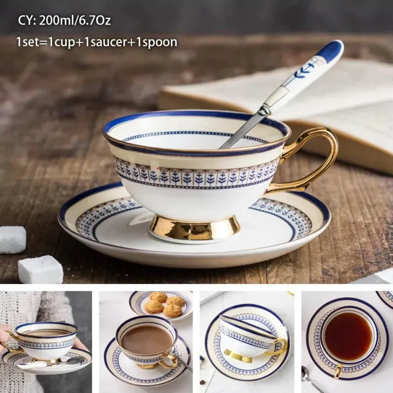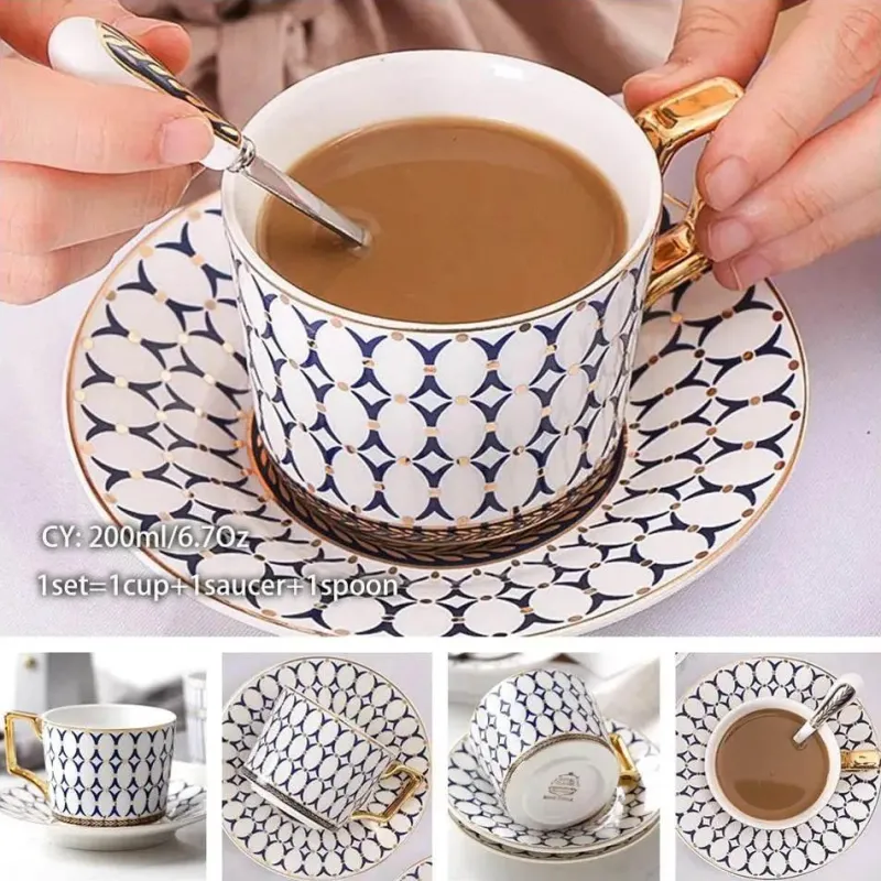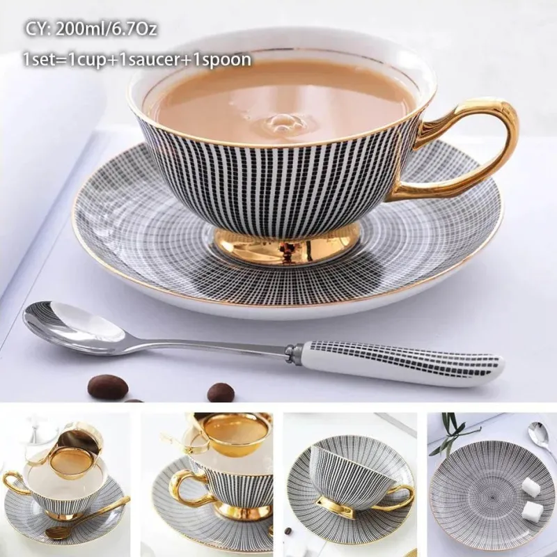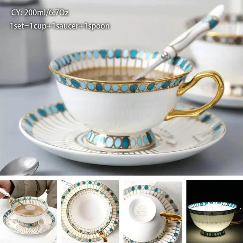 Entdecken Sie die raffinierte Eleganz unseres luxuriösen Kaffeetassen-Sets aus Bone China. Es besteht aus einer wunderschön gefertigten 200-ml-Tasse, einer passenden Untertasse und einem filigran gestalteten Löffel. Dieses exquisite Set wurde sorgfältig entworfen, um Ihr Kaffeeerlebnis zu veredeln und spiegelt Raffinesse und stilvollen Charme wider.