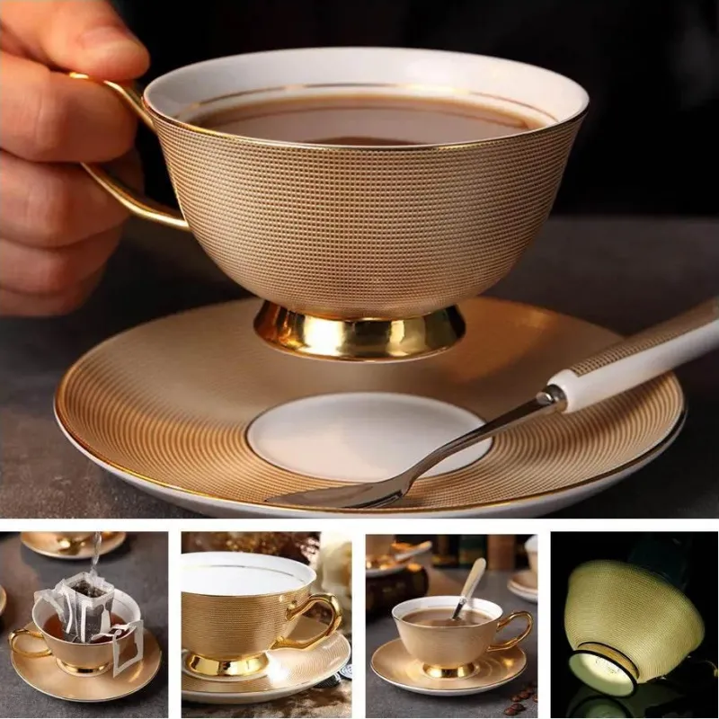 Jede Tasse bietet ein großzügiges Fassungsvermögen und eignet sich perfekt für den Genuss Ihrer Lieblings-Heißgetränke – egal, ob Sie einen kräftigen Espresso am Morgen oder einen beruhigenden Nachmittagstee bevorzugen. Das sorgfältig verarbeitete Porzellan besticht durch eine glatte, unglasierte Oberfläche und eine zarte Goldeinlage, die jedem Schluck einen Hauch von Eleganz verleiht.
