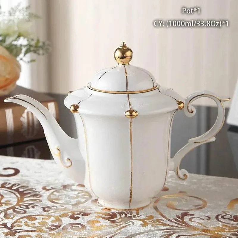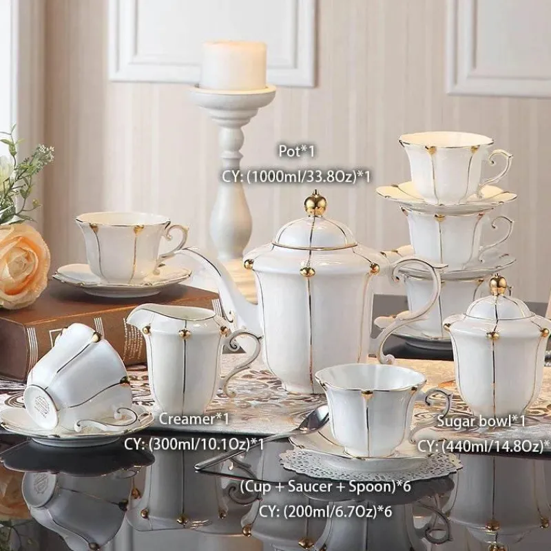 Wir präsentieren ein elegantes Teeservice aus feinem Bone China – eine perfekte Ergänzung für Ihre Geschirrsammlung, die Luxus und Eleganz perfekt vereint. Dieses sorgfältig zusammengestellte Set umfasst über acht kunstvoll gestaltete Teile, darunter eine Kaffeekanne, ein Milchkännchen und eine Zuckerdose, die alle für ihre Liebe zum Detail stehen.