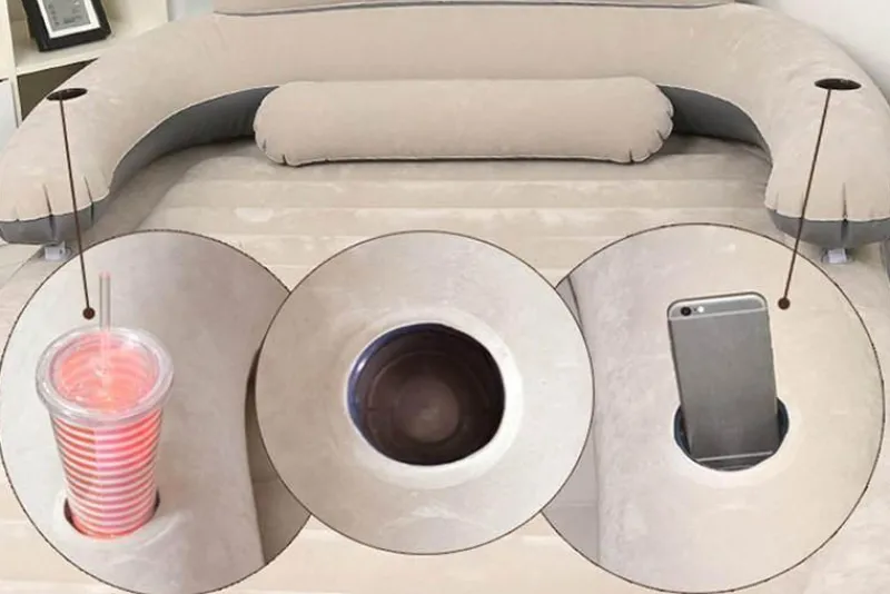 Bei Nichtgebrauch lässt sich das aufblasbare Bett bequem zusammenfalten und verstauen. Dank seines leichten Designs lässt es sich mühelos transportieren und ist somit ideal für Gäste. Das Bett verwandelt sich außerdem in ein Luftsofa mit verstellbarer Rückenlehne und erfüllt so Ihre Entspannungsbedürfnisse. Für zusätzlichen Komfort bietet ein integrierter Getränkehalter einen sicheren Platz für Ihr Getränk, während Sie sich entspannen.