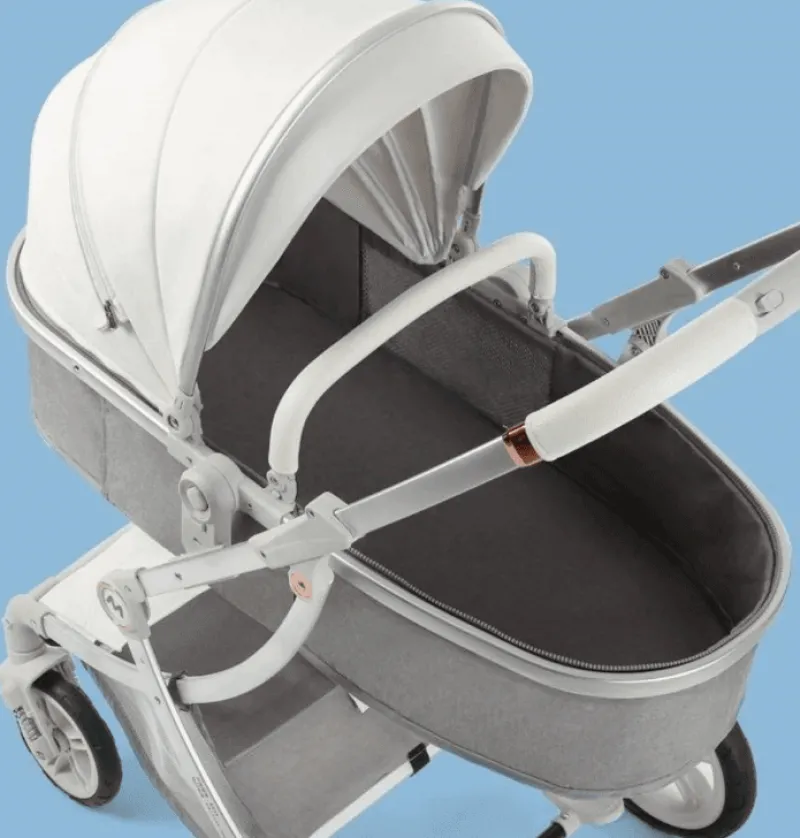 Wir präsentieren den 3-in-1 Futuristic Kinderwagen – ein vielseitiges Reisesystem für moderne Eltern unterwegs. Dieser innovative Kinderwagen passt sich mühelos dem Wachstum Ihres Kindes an und verwandelt sich von einer gemütlichen Babywanne in einen nach vorn gerichteten Kinderwagen. Jede Konfiguration bietet Ihrem Kleinen Komfort und Sicherheit in jeder Entwicklungsphase.