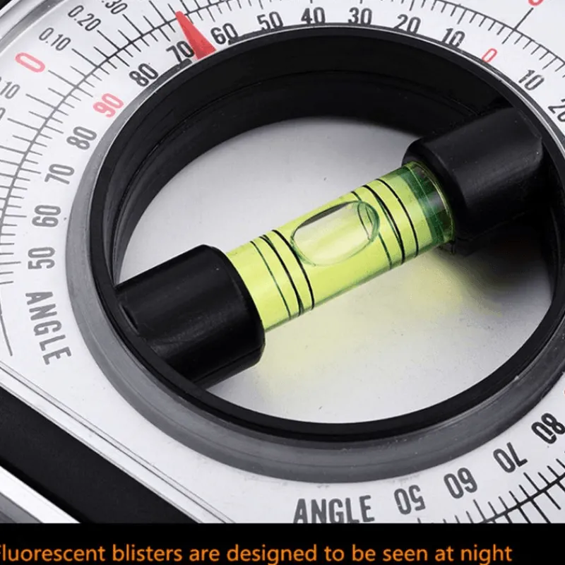 Zur Verwendung drehen Sie einfach die Rändelschraube, bis die Libelle waagerecht steht. Dieses technische Neigungsmessgerät ist vielseitig einsetzbar und eignet sich für eine Vielzahl von Anwendungen, darunter Tiefbau, Bauprojekte, Innenarchitektur und alle technischen Arbeiten, bei denen Neigungs- und Neigungswinkel gemessen werden.