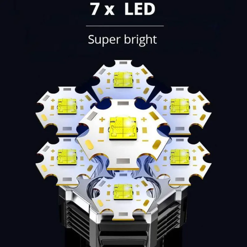 Die Vorderseite der Taschenlampe ist mit sieben leistungsstarken LED-Leuchten ausgestattet, die eine hervorragende Helligkeit liefern und Ihnen bis zu 100 Meter weit klare Sicht ermöglichen. Zusätzlich verfügt sie über ein COB-Seitenlicht, das als effektives Flutlicht dient und eine breite Beleuchtung für verschiedene Anwendungen bietet.
