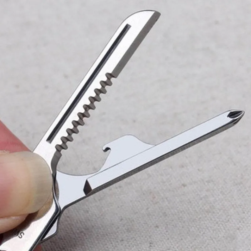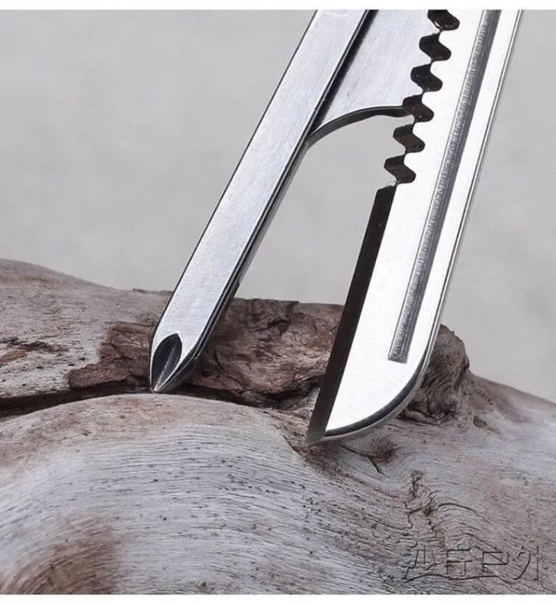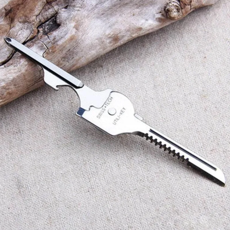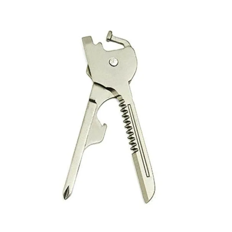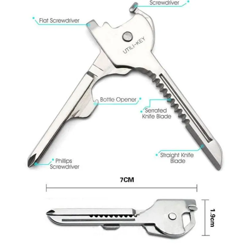 Der komplett aus Edelstahl gefertigte Schlüsselanhänger im Miniformat ist leicht zu tragen und verfügt über 6 Funktionen. Wenn Sie ihn um etwa 90 Grad nach oben ziehen, können Sie einen Schlitz sehen.