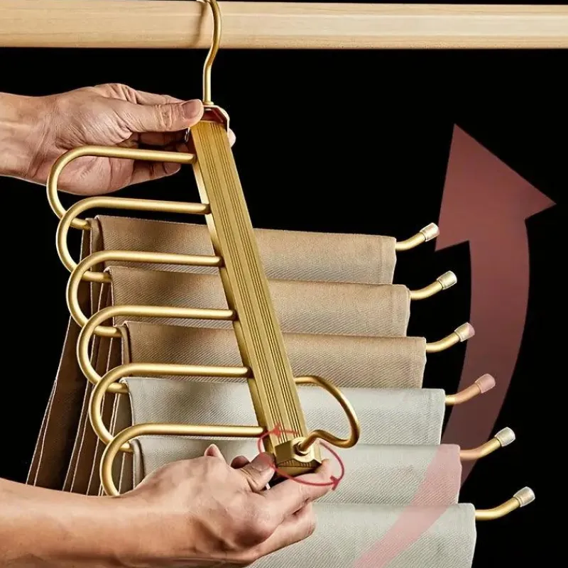 Halten Sie Ihre Kleidung sauber und geordnet und sparen Sie gleichzeitig wertvollen Platz mit diesem drehbaren, zusammenklappbaren 6-in-1-Hosenbügel, ein Muss für jede Garderobe zu Hause oder auf Reisen!