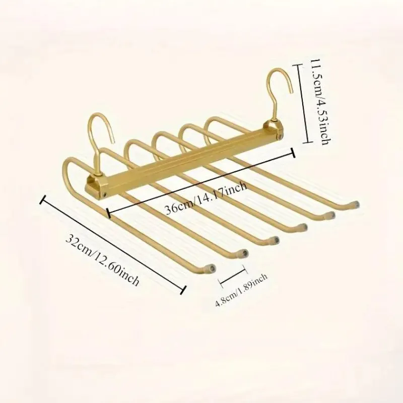 Maximieren Sie Ihren Kleiderschrankplatz mit diesem drehbaren, faltbaren 6-in-1-Hosenbügel. Er sorgt für Ordnung und Platzersparnis bei der Aufbewahrung Ihrer Hosen, Hosen und anderer Kleidungsstücke. Dank seines rutschfesten Designs bleibt Ihre Kleidung an Ort und Stelle und verrutscht nicht. Perfekt für Hotels, die Aufbewahrung zu Hause und auf Reisen. Er ist robust, kompakt und benutzerfreundlich und somit eine unverzichtbare Ergänzung für Ihren Kleiderschrank oder Ihr Gepäck.