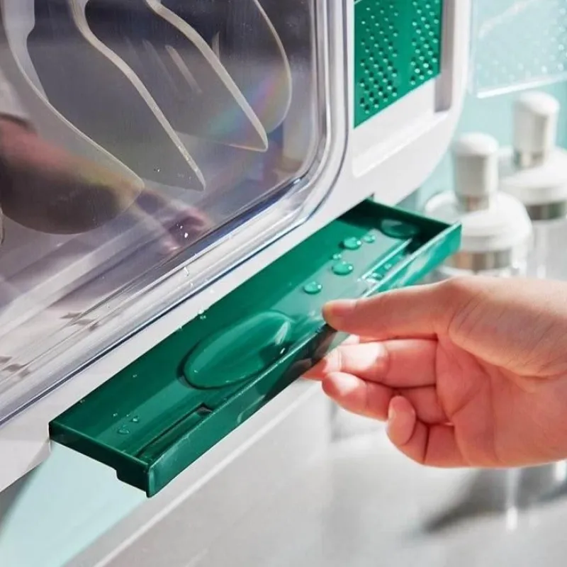 Dieses wasser- und staubdichte Aufbewahrungsregal sorgt dafür, dass Ihre Küchenutensilien hygienisch und vor Verunreinigungen geschützt bleiben. Sein durchdachtes Design schützt nicht nur Ihre Küchenutensilien, sondern trägt auch zu einer saubereren Küchenumgebung bei.