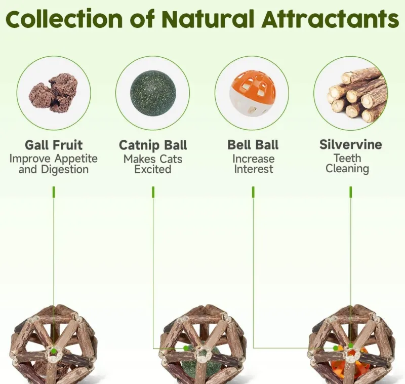 Unsere Minzbällchen fördern nicht nur das Spielvergnügen, sondern unterstützen auch eine gesunde Verdauung. Die Ballaststoffe aus Katzenminze, Silberwein und Gallfrucht fördern die Magen-Darm-Beweglichkeit, tragen zur Reduzierung von Haarballen bei und verbessern die allgemeine Verdauungsgesundheit. Sollte Ihre Katze mit der Zeit das Interesse verlieren, kann ein einfaches Abschneiden der Silberweinstäbe den Duft auffrischen und das Spielerlebnis beleben.