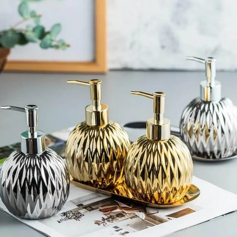 This thoughtfully designed bath accessory set includes two lotion dispensers and a convenient amenity tray, all made from high-quality ceramic to ensure both durability and style. For optimal performance, it is recommended to use only liquid lotion in the dispensers. Maintaining this set is easy; simply wipe the surfaces with a soft cloth dampened with water.