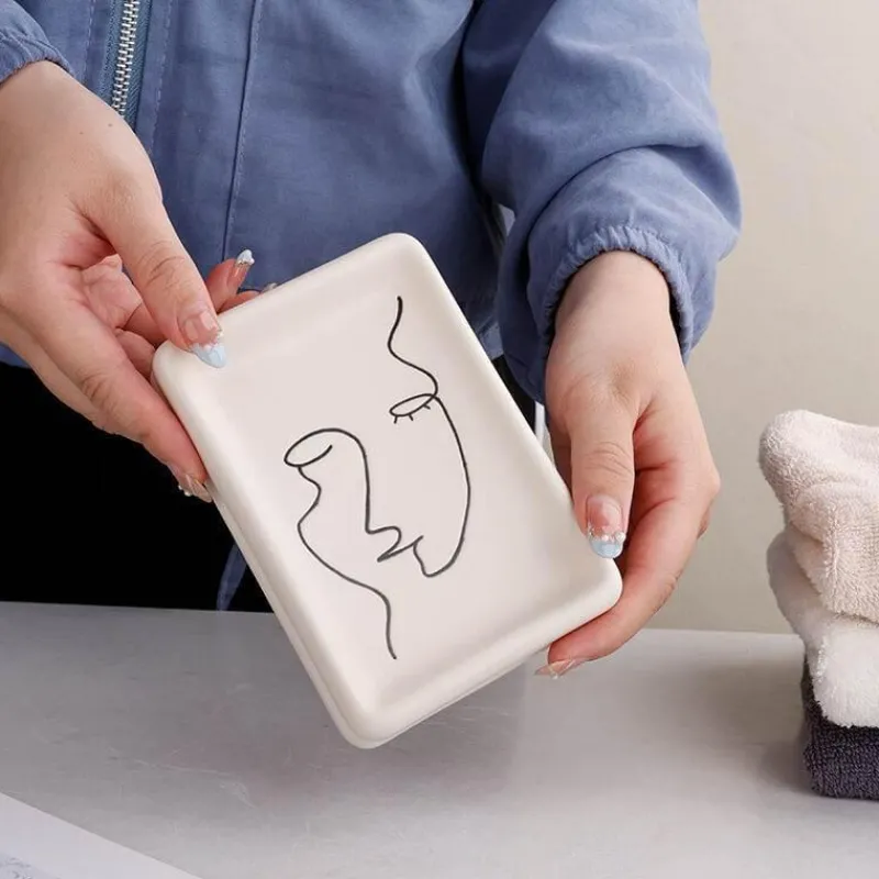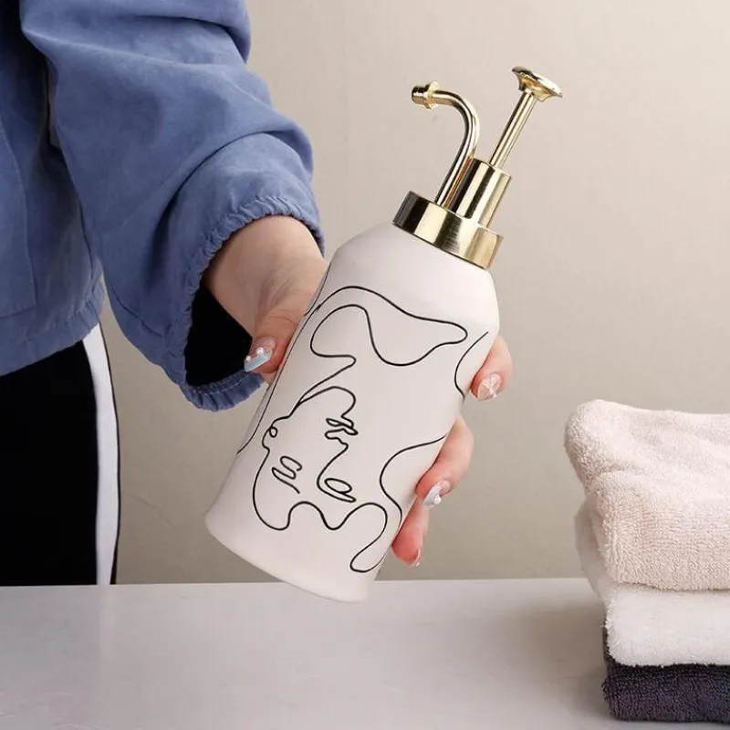 Enhance your bathroom with this beautifully crafted four-piece ceramic set featuring elegant line drawings and abstract art patterns. Thoughtfully designed for both practicality and style, this collection includes a soap dispenser, a wash cup, a toothbrush holder, and a soap dish, all essential items for your daily routine.