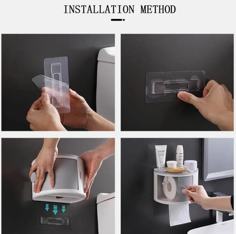 Dieser Toilettenpapierhalter mit Schiebetür hält Ihre Rollen trocken und sauber. Das benutzerfreundliche Montagesystem ermöglicht eine einfache und beschädigungsfreie Montage an jeder Wand und bietet so eine praktische Möglichkeit, den Platz im Badezimmer optimal zu nutzen.