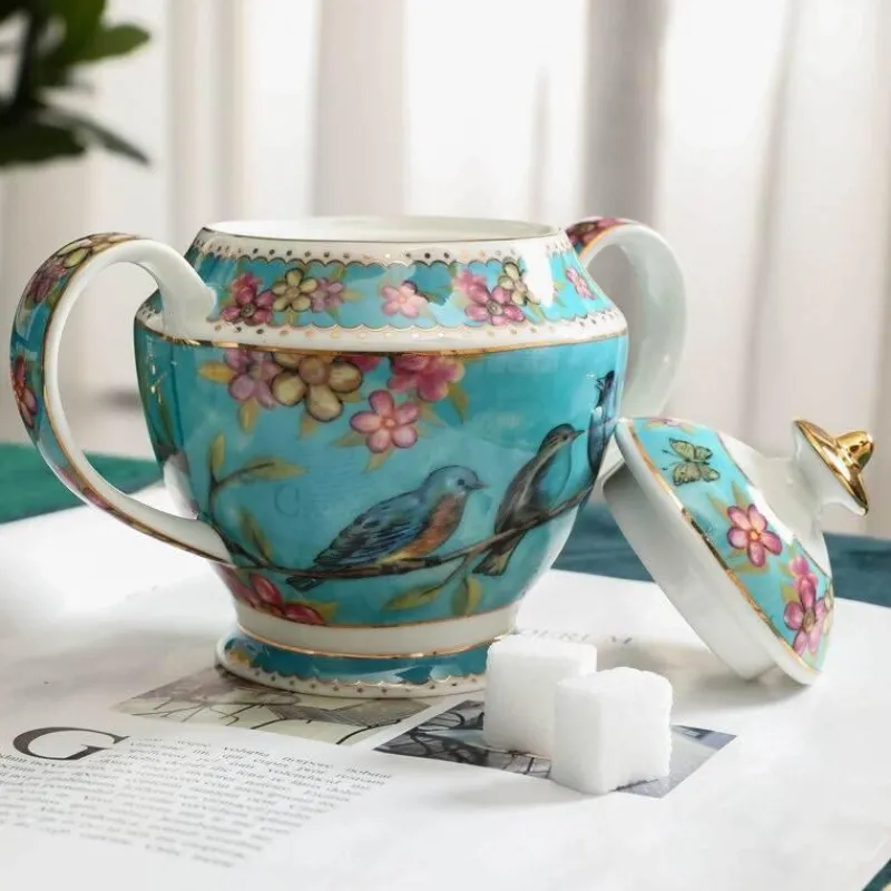 Verschönern Sie Ihre Tee- und Kaffeerituale mit diesem europäischen „Blue Bird“-Set aus Bone China. Es ist sorgfältig für den täglichen Gebrauch und besondere Anlässe gefertigt. Diese beeindruckende Porzellankollektion umfasst elegant gestaltete Tassen, eine charmante Teekanne, eine Zuckerdose und ein Milchkännchen aus hochwertigem Bone China, die Ihr Serviererlebnis veredeln.