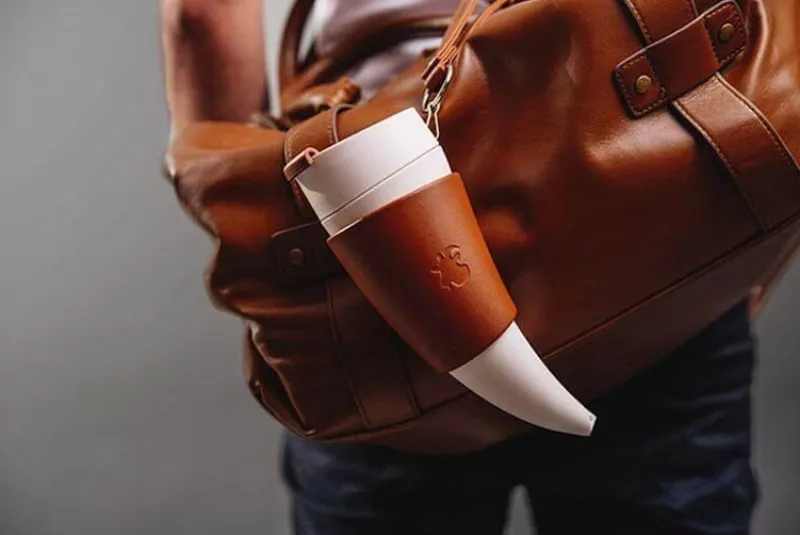 Die Lederhülle unterstreicht die Ästhetik des Bechers und dient gleichzeitig als Ständer. So können Sie den Becher problemlos auf jeder Oberfläche abstellen. Dieser Thermosbecher besteht aus BPA-freien Materialien und bietet höchste Sicherheit und Gesundheit.