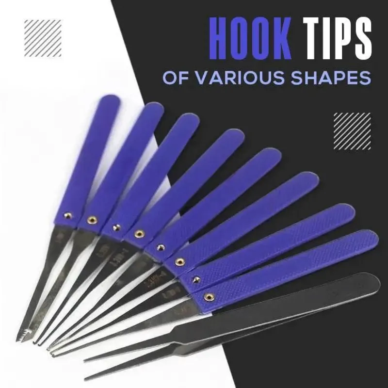 Das professionelle Schlossreparatur-Set wurde speziell für die präzise und einfache Reparatur von Autoschlüsseln und verschiedenen Schlössern entwickelt. Das Set enthält eine große Auswahl an Präzisionshakenspitzen in unterschiedlichen Formen, Längen und Winkeln. So können Sie auch in engen Räumen problemlos verschiedene Reparaturaufgaben erledigen.