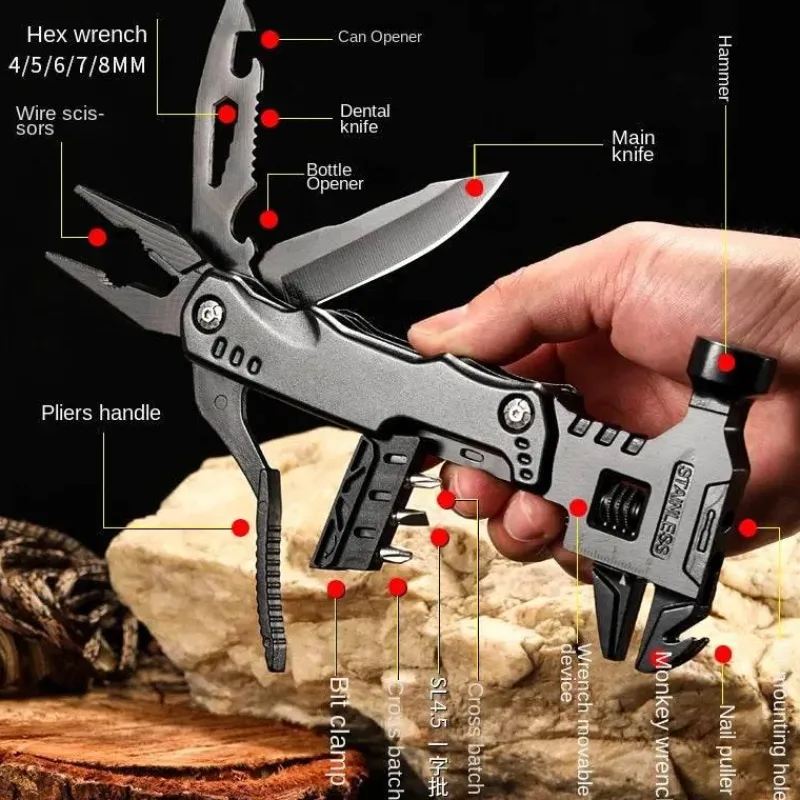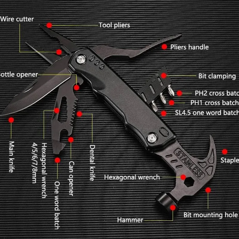 Dieses Multifunktionswerkzeug vereint mehrere wichtige Funktionen, darunter einen Minihammer, eine Zange, einen Flaschenöffner, Schraubendreher-Bits und einen Nagelzieher, und ist damit ein unschätzbarer Helfer für eine Vielzahl von Aufgaben. Zu Hause eignet es sich perfekt für Heimwerkerprojekte und Möbelreparaturen. In der Natur vereinfacht es den Zeltaufbau und das Holzhacken. Unterwegs dient es als zuverlässiges Werkzeug für Notfälle und zur Selbstrettung.
