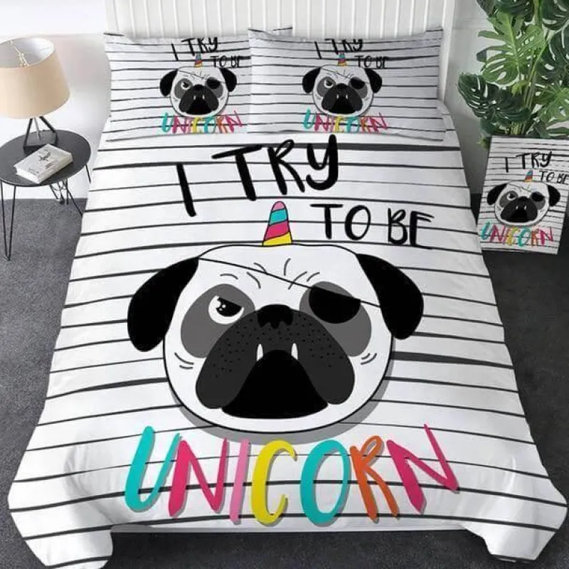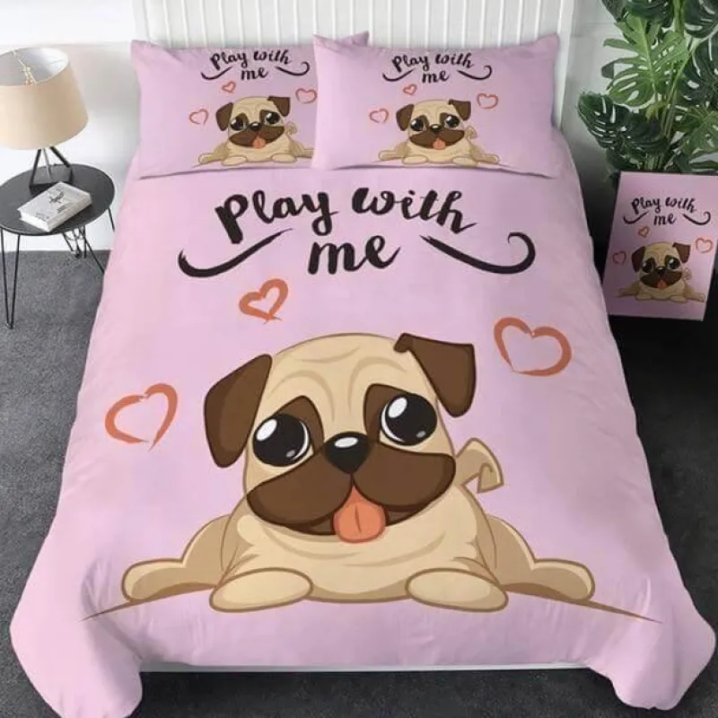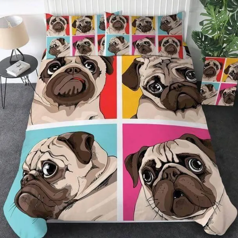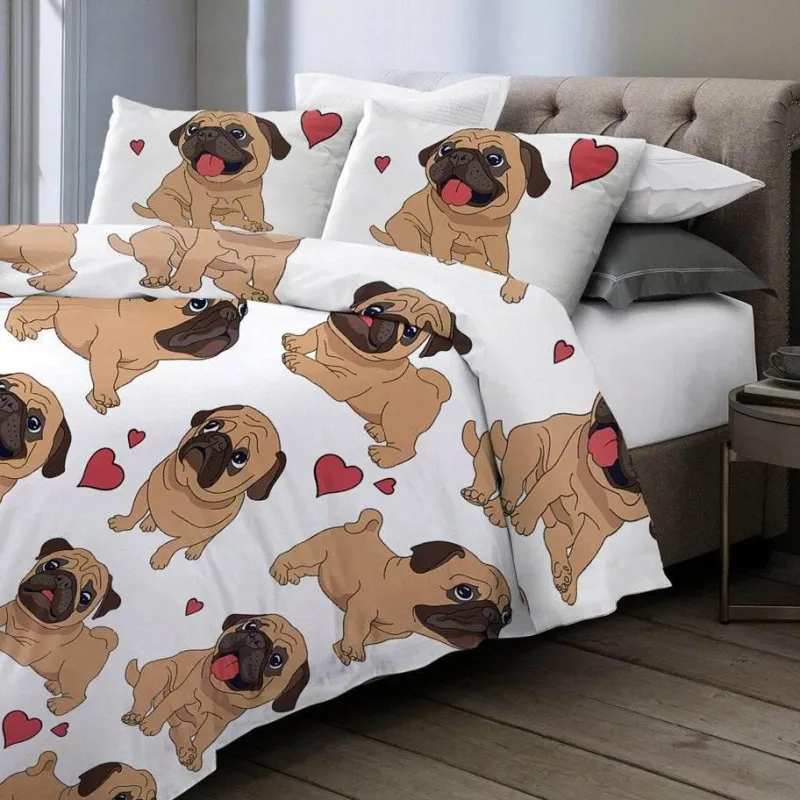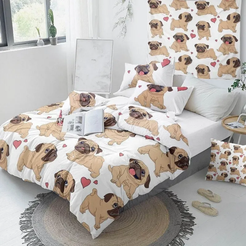 In der Box finden Sie drei Teile des Hippie-Mops-Welpen-Cartoon-Bettbezug-Sets. Lassen Sie sich vom fröhlichen Geist dieser Kollektion verzaubern und verwandeln Sie Ihr Schlafzimmer in einen einladenden Rückzugsort.