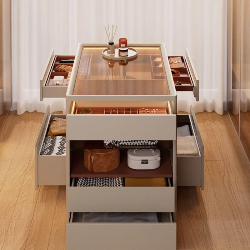 Entdecken Sie einen exquisiten Garderobenschrank, der Stil und Funktionalität perfekt vereint und sowohl Ordnung als auch Ästhetik in Ihrem Raum schafft. Dieser Inselschrank besticht durch durchdachte Staufächer an drei Seiten und ist der ideale Blickfang für jeden Raum. Das halbtransparente, gelbbraune Hartglas ermöglicht einen subtilen Blick auf Ihre Gegenstände und sorgt für eine edle Präsentation, die das Ambiente Ihres Raumes bereichert.