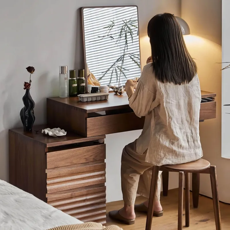 Verschönern Sie Ihr Schlafzimmer oder Ankleidezimmer mit diesem eleganten Schminktisch, der sowohl stilvoll als auch funktional ist. Der aus hochwertigem Holz gefertigte Schminktisch besticht durch seine edle Ästhetik und verleiht jedem Raum Eleganz. Ein besonderes Merkmal ist der austauschbare Schrank, der es Ihnen ermöglicht, den Schminktisch für Links- oder Rechtshänder individuell zu gestalten und so optimalen Komfort für Ihre Bedürfnisse zu bieten.