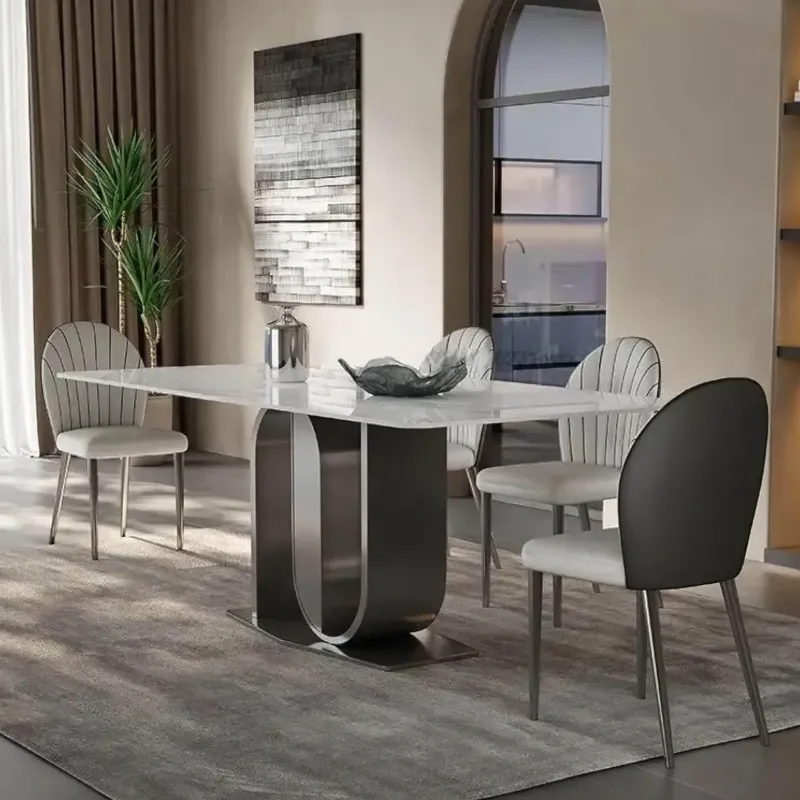 Der Tisch wird von einem stabilen, goldenen Edelstahlrahmen getragen und verkörpert ein raffiniertes Design, das klare Linien mit feinen Details elegant verbindet. Diese Kombination sorgt für optische Akzente und macht ihn zu einem Blickfang in jedem Raum. Die warme, goldene Oberfläche ergänzt die natürliche Schönheit des Schiefers und macht ihn zu einem faszinierenden Mittelpunkt, der aus allen Blickwinkeln die Blicke auf sich zieht.