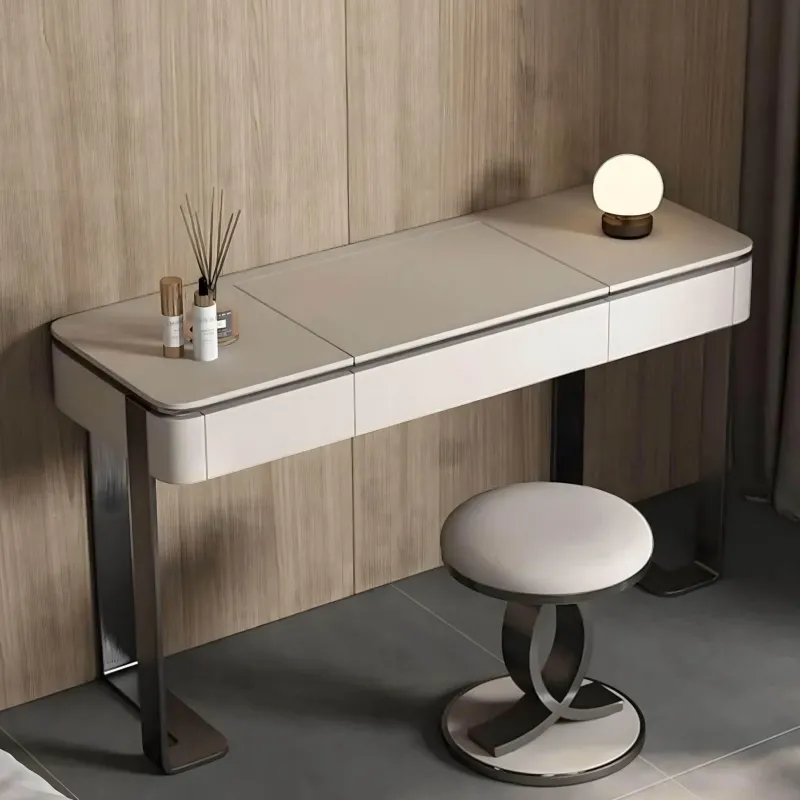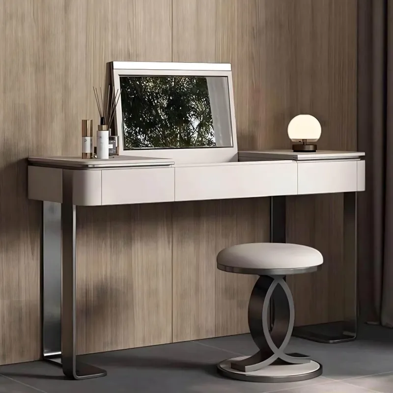 Entdecken Sie moderne Eleganz mit dem Ivano Frisiertisch, einem durchdachten Schminktisch, der als platzsparende Lösung für jedes Schlafzimmer oder Ankleidezimmer dient. Dieses stilvolle Möbelstück verfügt über einen integrierten Spiegel, der sich mühelos in die Arbeitsplatte einklappen lässt und so Komfort und Flexibilität im Alltag bietet. Die massiven Edelstahlbeine des Frisiertisches versprechen Langlebigkeit und verleihen Ihrem Raum einen Hauch von Eleganz.
