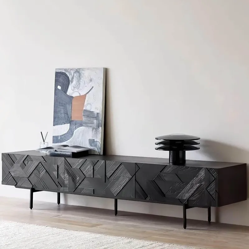 Der Tawaba TV-Schrank vereint auf wunderschöne Weise Stammesinspiration mit handwerklicher Handwerkskunst und ist eine bemerkenswerte Ergänzung für Ihren Wohnraum. Handgefertigt aus hochwertigem Eichenholz besticht dieses Entertainment-Möbel durch aufwendige handgeschnitzte Details, die die reichen Traditionen der Stammeskunst würdigen. Jeder Schrank ist ein Unikat, sodass kein Möbelstück dem anderen gleicht.