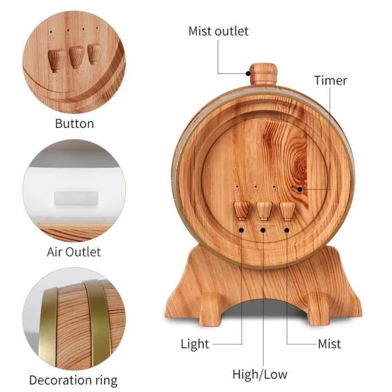 Mit seiner kunstvollen, von Weinfässern inspirierten Silhouette und seiner praktischen Funktionalität ist dieser Aromadiffusor eine einzigartige Ergänzung für jedes Zuhause oder Büro. Er schafft eine beruhigende Atmosphäre, bietet die wohltuende Wirkung ätherischer Öle und erhöht die Luftfeuchtigkeit in Ihrer Umgebung.