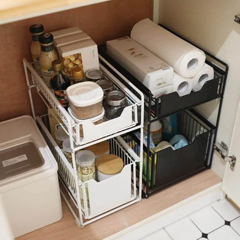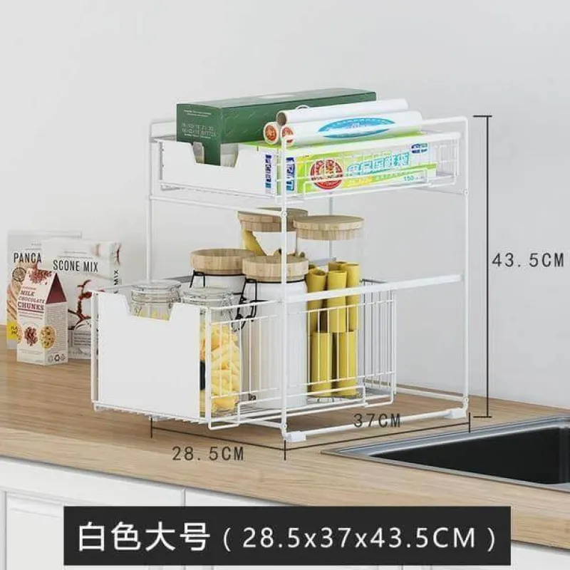 Maximieren Sie Ihren Stauraum unter der Spüle mit diesem stilvollen und langlebigen Organizer, der Ihre Küchen- und Badezimmerutensilien übersichtlich hält. Dieses mehrstufige Regal bietet eine praktische Lösung, um Ihre Arbeitsflächen aufzuräumen und Platz für Backzubehör, Recyclingbehälter und andere Gegenstände zu schaffen, die einen festen Platz benötigen.