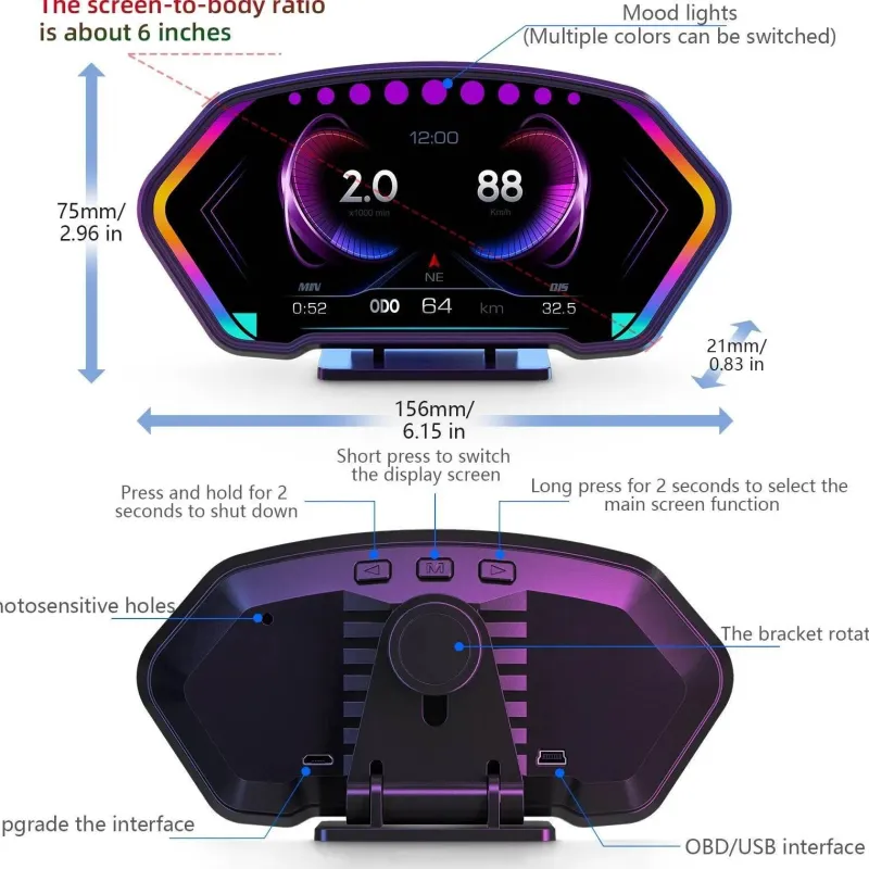 Verbessern Sie Ihr Fahrerlebnis mit diesem kristallklaren Head-up-Display-Tachometer, der präzise und leicht ablesbare Geschwindigkeitsmessungen liefert. Dieses innovative Autozubehör projiziert wichtige Informationen direkt auf Ihre Windschutzscheibe, sodass Sie stets informiert sind, ohne Ihre Aufmerksamkeit von der Straße abzuwenden. Erleben Sie eine moderne und effiziente Möglichkeit, Ihre Geschwindigkeit zu überwachen und gleichzeitig die Vorteile fortschrittlicher Technologie zu nutzen.