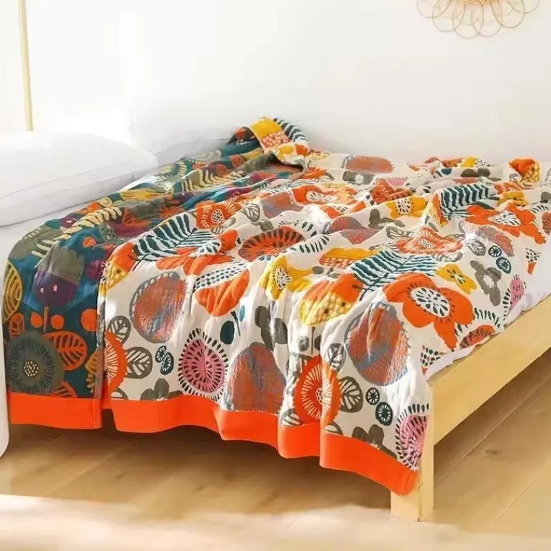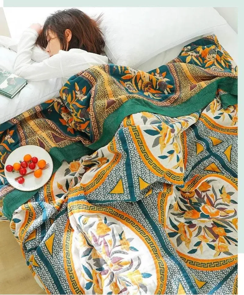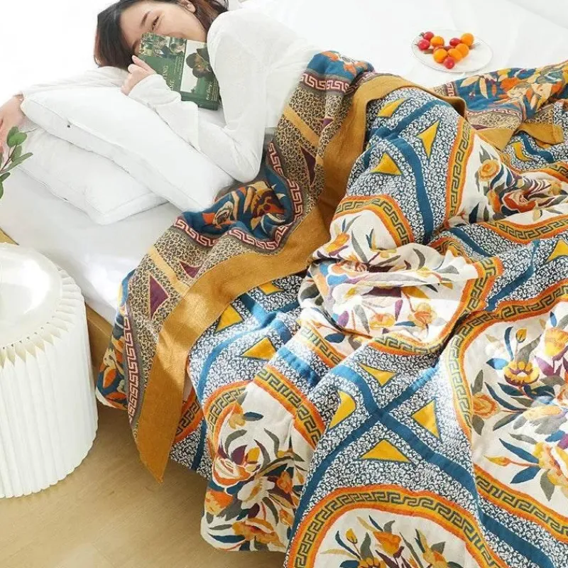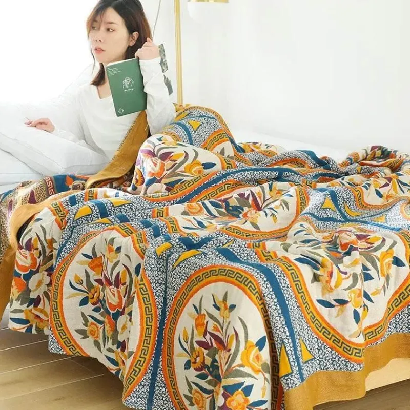 Wir präsentieren die Baumwollgaze-Decke – die ideale Kombination aus Stil und Funktionalität für Ihr Zuhause. Diese Decke aus 100 % Baumwolle der Güteklasse A besticht durch ihre weiche und atmungsaktive Textur und ihr bezauberndes Blumenmuster unterstreicht die Bohème-Ästhetik jedes Bettes oder Sofas.